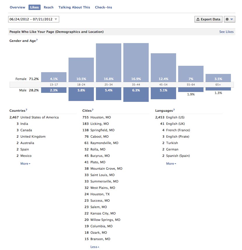 Facebook Insights (the built-in analytics) can let brands know who they’re reaching. In the case of the Houston Herald, the fans of the page are 71.2% female and 28.2% male. Click the screen grab to see how that breaks down by age, and also where the fans are geographically.
