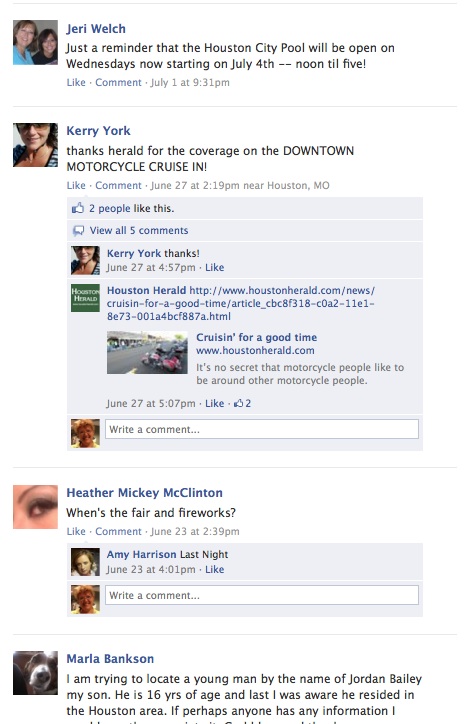 My research into how Missouri’s community newspapers are making the transition to the digital world led me to discover one of my all-time favorite newspaper Facebook pages. Allow me to introduce you to the Houston Herald, which takes the news directly to its community in a way that respects readers’ time and makes it easy to be in the know.