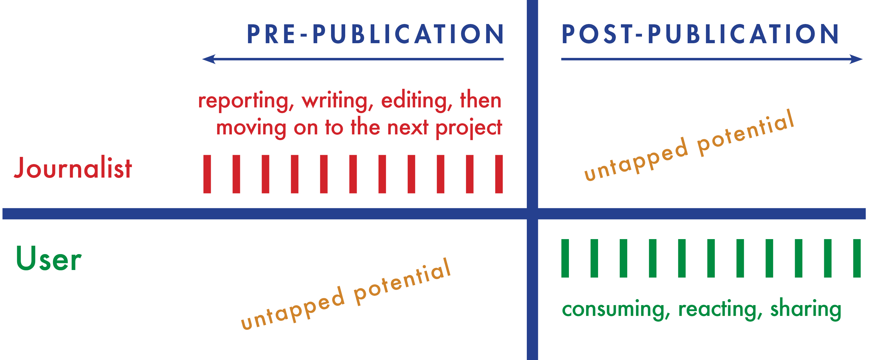 The horizontal line is the process of journalism. The vertical line represents publication. Above the line are the actions of journalists. Those folks traditionally work really hard up until publication, then return to the beginning to start something new. Below the line are the users, whose role has always come after publication, reacting and sharing.